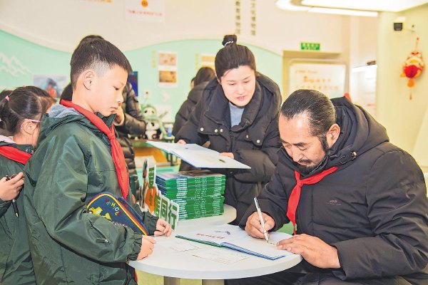 活動尾聲,其美多吉與兒童郵局的師生,在點綴著馬年新春元素的郵局前并肩合影。鏡頭定格下一張張燦爛笑臉,孩子們眼中被榜樣精神點亮的光芒,比現(xiàn)場的年味裝飾更顯耀眼。(圖為贈書環(huán)節(jié),其美多吉為學生在繪本上簽名。)
