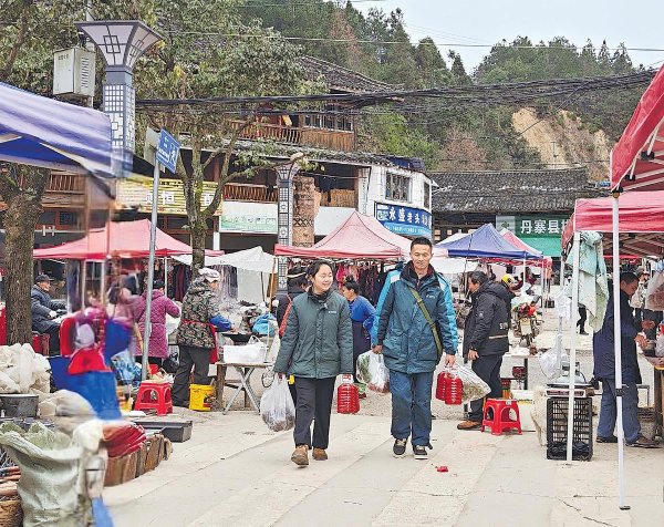 1月20日,貴州省丹寨縣排調(diào)鎮(zhèn)鄉(xiāng)場里,郵政“云上集市”工作人員拎著滿滿幾袋年貨,準(zhǔn)備打包寄給在他鄉(xiāng)務(wù)工的鄉(xiāng)親?! 蹴n靜樺 攝