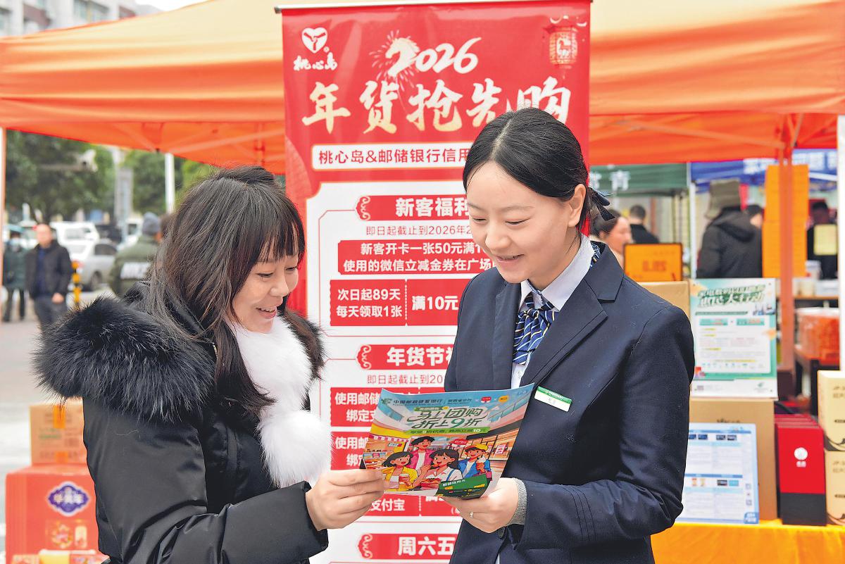 1月23日,陜西省漢中市“陜亮生活 惠購漢中”新春年貨購物節(jié)現(xiàn)場,郵儲(chǔ)銀行漢中市分行工作人員為消費(fèi)者詳細(xì)介紹“年貨搶先購”優(yōu)惠活動(dòng)。該分行通過開展惠民金融宣講、特色產(chǎn)品展示及互動(dòng)體驗(yàn)等形式,為市民送上新春“金融禮包”,以金融“活水”精準(zhǔn)支持消費(fèi)市場,助力市民樂購年貨、溫暖迎春,有效激發(fā)地方消費(fèi)活力。