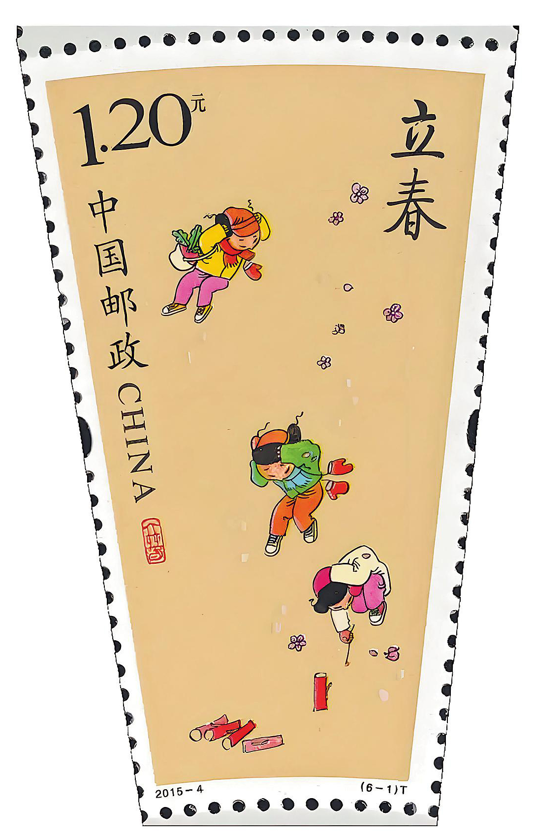 在傳統(tǒng)觀念中,立春有吉祥的含義。在古代,立春是重要的祭祀節(jié)日,也是勸農(nóng)備耕的重要時節(jié),后來逐漸演變?yōu)榱鱾髑甑母鞣N民俗,包括演春、迎春、打春、咬春等。中國郵政發(fā)行的《二十四節(jié)氣(一)》特種郵票中,第1枚便是“立春”。郵票畫面為放鞭炮的歡樂小孩子點燃鞭炮,捂住耳朵,人物造型生動活潑,充滿著喜慶氣氛。