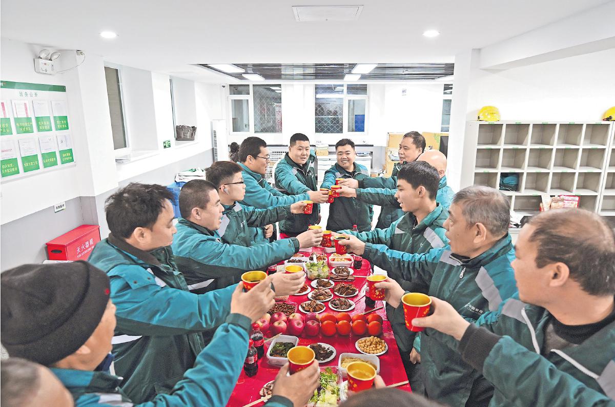 杯中倒?jié)M甘甜飲料,各色熟食擺盤上桌,十幾名攬投員圍席而坐——晚上7點(diǎn),一場溫暖的團(tuán)聚如期而至?!昂芨吲d今年又能和大家一起堅守崗位,感謝你們舍小家、顧大家,保障城市用郵,提前給大家拜年!”隨著王天來的深情祝福,大家舉杯共慶新春。歡聲笑語伴著美食的香味很快在空氣中彌漫開來,滿是家的味道。