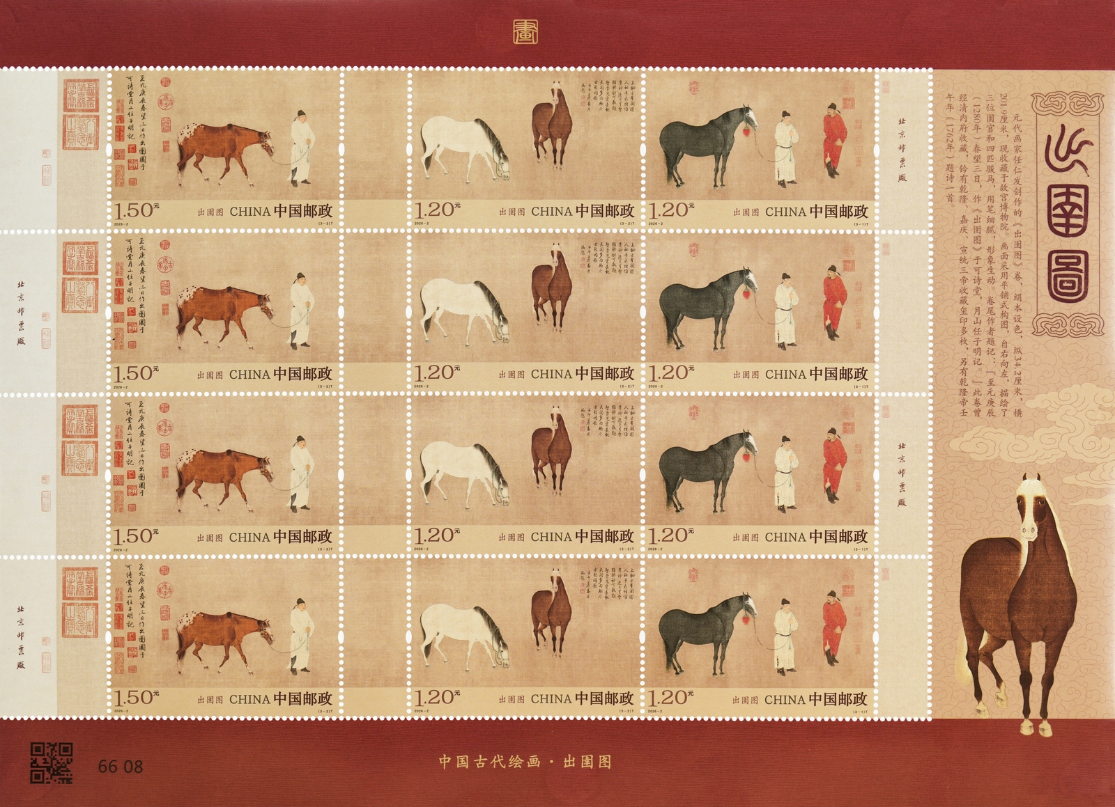 中國郵政定于2026年3月3日發(fā)行《出圉圖》特種郵票1套3枚。詳情如下: